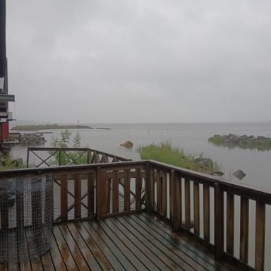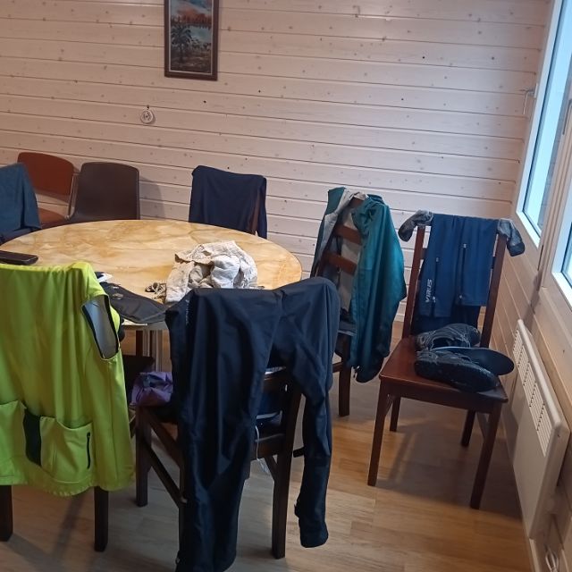 Endlich angekommen, trat absolute Ernüchterung ein. Wo sollte ich auf diesem kleinen überschwemmten Rasen das Zelt aufbauen? Und wo sind hier irgendwelche Menschen? Recherchen nach anderen erreichbaren Unterkünften blieben erfolglos. Dann entdeckte ich ein Mini Hinweisschild mit der Info, Kent anzurufen. Flugs getan, der kam auch recht flott und verkündete umgehend, dass ich hier nicht zelten könne. Bevor mir alles aus dem Gesicht gleiten konnte, fügte er hinzu, dass das zu gefährich sei. Es sei Unwetter mit orkanartigen Böen angesagt. Ich könne in der Mitarbeiterhütte übernachten. Triefend folgte ich ihm in eine schnuckelige, direkt am Wasser gebaute Hütte. Er stellte die Heizung auf volle Pulle und wünschte mir angenehme Nachtruhe.