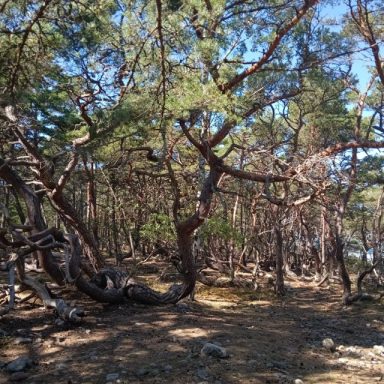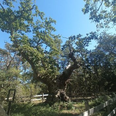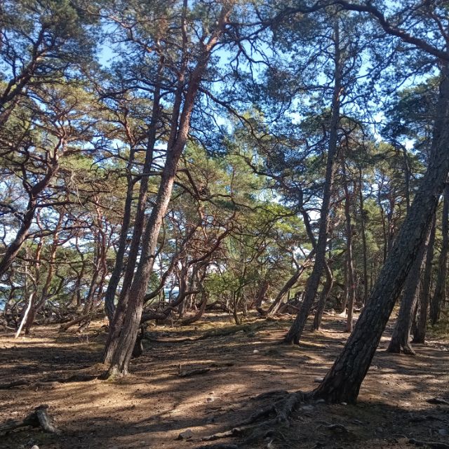 Vom Campingplatz aus starte ich ohne Gepäck (wie leicht man plötzlich vorwärts kommt😁) Richtung Norden. Beeindruckend der Trollskogen, ein alter von weidendem Vieh geprägter Nadelwald. Er strahlt eine ganz eigentümliche Atmosphäre aus mit seinen windgepeitschten Kiefern und "mürrischen" Eichen (nette Beschreibung von der Infotafel). Immer noch beeindruckend sieht die 900 jährige Troll - Eiche aus. Sie soll früher den Seefahrern als Landmarke gedient haben.
